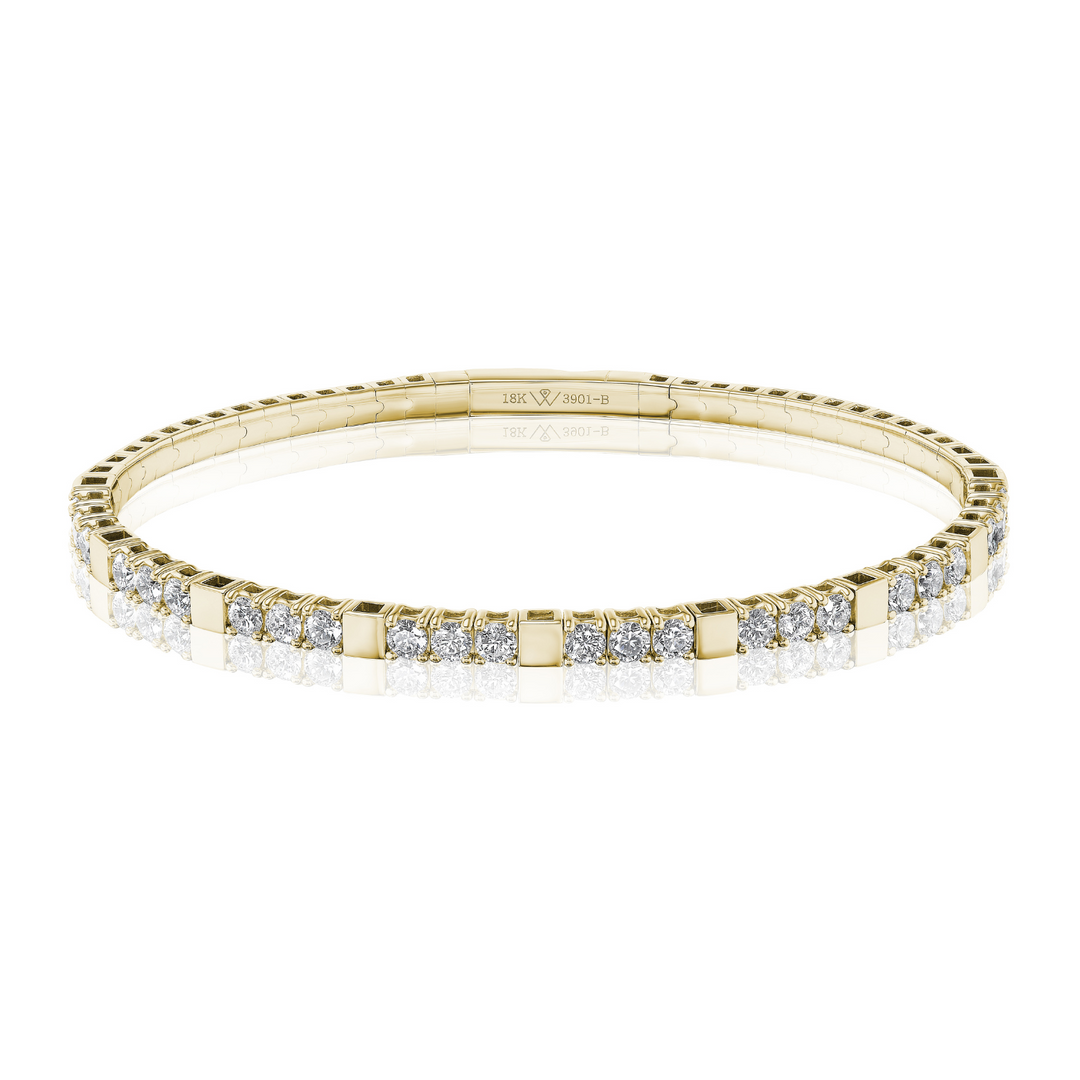 A seamless blend of elegance and innovation, this Diamond Pattern Flex Bracelet is crafted in 18K white gold and designed for effortless wear. Featuring a striking sequence of G-H SI round brilliant diamonds set in a distinctive geometric pattern, this bracelet offers a refined yet modern aesthetic. The advanced flex mechanism ensures a comfortable, flexible fit, making it the perfect addition to any jewelry collection.